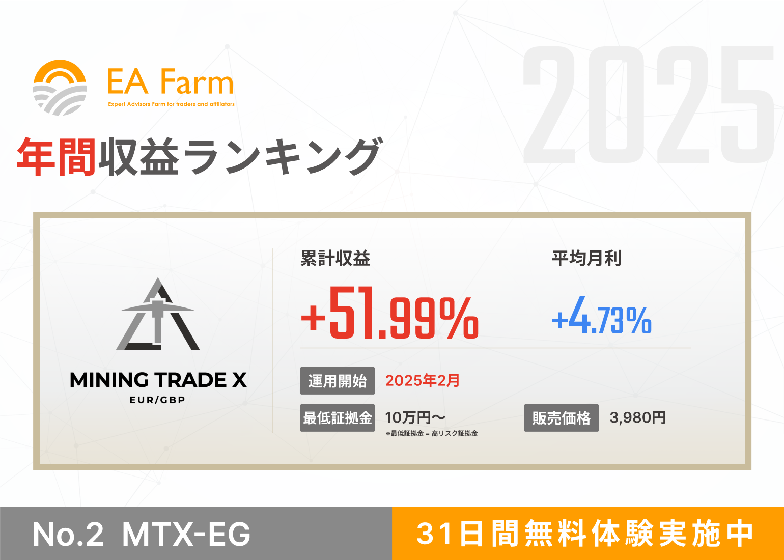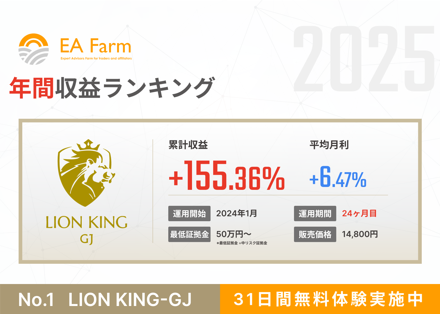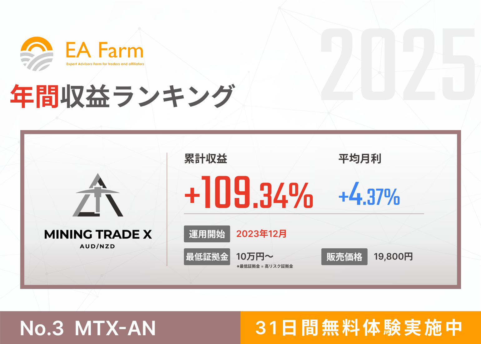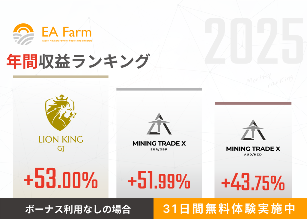 2025年の年間運用ランキングは常連シリーズに加え、マーチンなしのナンピンEAが並びました。