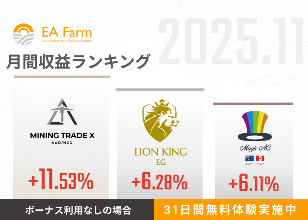 各月の自動売買(EA)の月利ランキング上位TOP3を紹介しています。